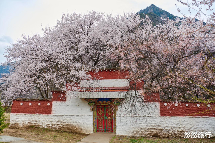 小众的波密倾多寺,古寺外雪山环绕,寺内桃花掩映着红墙。