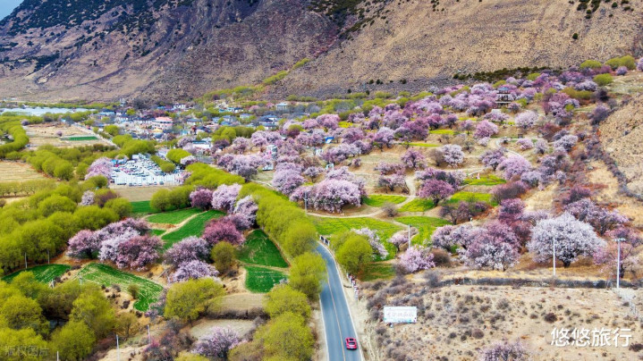 雅鲁藏布江峡谷山腰处的索松村,桃林与南迦巴峰同框,宛如瑶池画卷。
