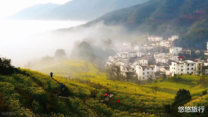 重重叠叠的梯田油菜花与徽派古村庄相映,白墙黛瓦在花海中若有若无,组成一幅绝好意思的郊外画卷。