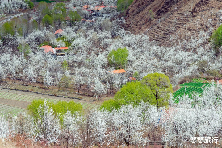 沙尔乡梨花密集,好意思不堪收。至人包万亩梨花绽放,俯视山下城镇。梨树繁密,终点合适拍摄东谈主像。