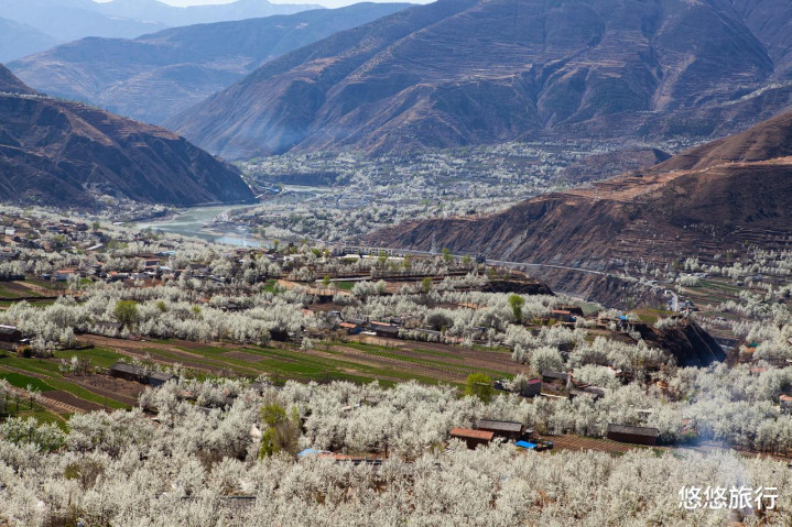 每年3月中旬-4月上旬,金川县与丹巴县之间的大金川河谷两侧,万亩梨树盛放清白梨花,开出一场春天的视觉盛宴。