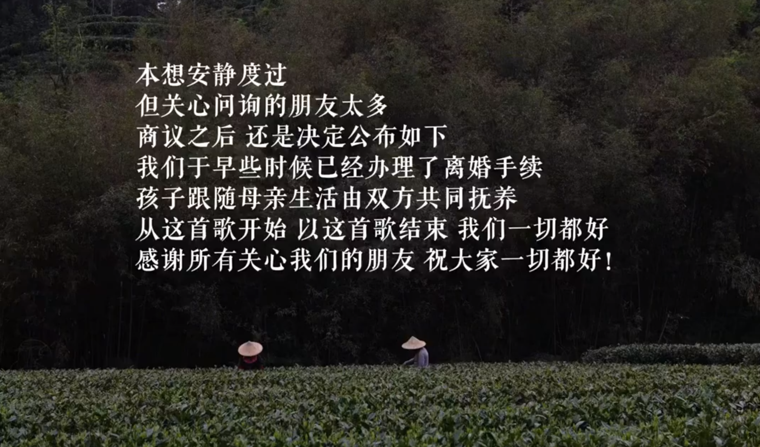 和一般明星发笔墨不同,两个东谈主用一条共创视频布告。视频以两个东谈主采茶像片为配景,回荡出现离异案牍: