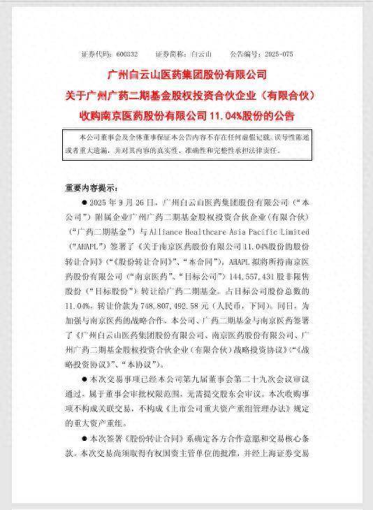 9月28日,广药集团旗下上市公司广州白云山医药集团股份有限公司(以下简称“白云山”,证券代码600332)与南京医药股份有限公司(以下简称“南京医药”,证券代码600713)同期发布公告:白云山旗下广州广药二期基金股权投资结伙企业(有限结伙)(以下简称“广药二期基金”)拟出资748,807,492.58元东谈主民币收购Alliance Healthcare Asia Pacific Limited(“AHAPL”)抓有的南京医药股份144,557,431股非限售股份,占南京医药总股份数的11.04%。